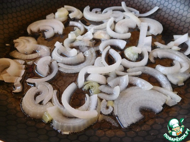 Лук режем полукольцами и обжариваем на растительном масле до прозрачности.