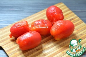 Помидоры окунуть в кипящую воду на полминуты (зависит от толстокожести помидоров), затем сразу в холодную воду, вынуть, снять кожицу