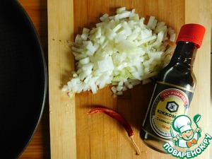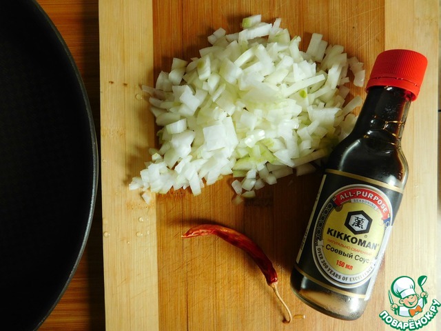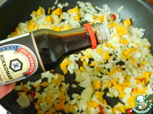 В сковороде разогреваем растительное масло. Пассеруем лук и перец 3-5 минут, постоянно помешивая. Далее добавляем соевый соус ТМ Kikkoman..