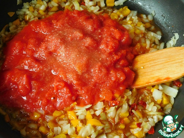 Добавляем очищенные консервированные помидоры, сахар, немного приправляем солью. Накрываем сковороду крышкой и тушим соус на медленном огне 20-25 минут.