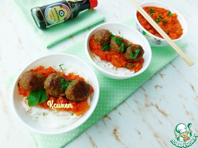 Осталось сервировать блюдо. Для этого раскладываем по пиалам рисовую лапшу, сверху щедрую порцию тайского соуса, несколько обжаренных тефтелей. И украшаем всю эту красоту свежей зеленью.