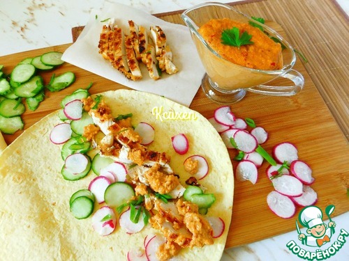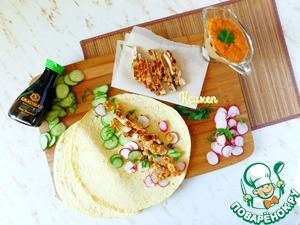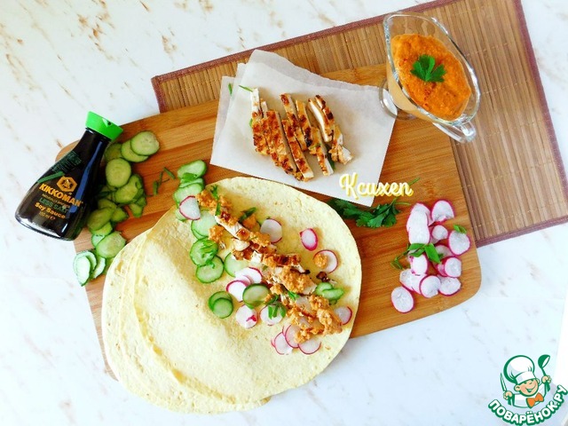 Пикантный и немного сладкий соус "Сатай" с выраженным ореховым вкусом. Он хорош и в качестве дипа. Но сегодня я использую идею Джейми Оливера и использую соус дважды в одном блюде: для создания корочки при приготовлении курицы-гриль и для сервировки блюда в тортильях.