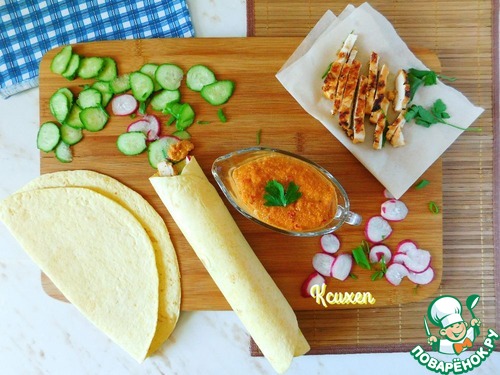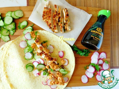 Готовое филе снимаем с гриля, даём "отдохнуть" 5-10 минут. В это время нарезаем огурцы и редис тонкими кружочками, лепёшки прогреваем с двух сторон на сухой сковороде.