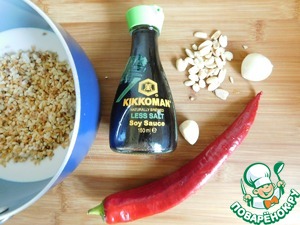 Туда же добавляем коричневый сахар, мелко нарезанный перец чили, имбирь и нарезанный чеснок.