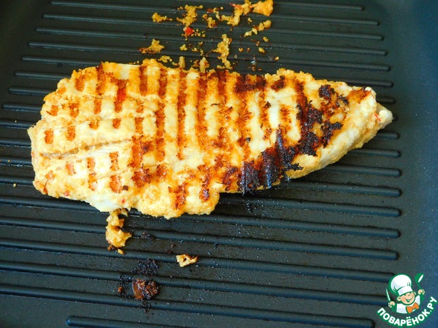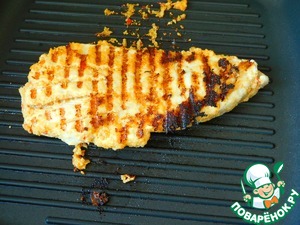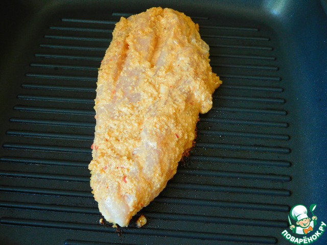 Разогреваем гриль (или сковороду-гриль). Сбрызгиваем куриное филе растительным маслом. Выкладываем мясо на гриль...
