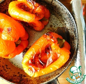 Когда кожица на перце покроется чёрными подпалинами, вынимаем сковороду из духовки и сразу укрываем фольгой. В таком виде даём перцу полностью остыть. За это время он пропарится от собственного жара, и обугленная кожица легко снимется. -