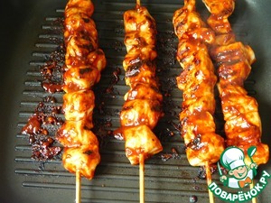 Сильно разогреваем сухую сковороду-гриль, выкладываем шпажки с филе и обжариваем со всех сторон до образования румяной корочки. Чтобы шашлычки быстрее готовились, я неплотно накрывала их куском фольги.