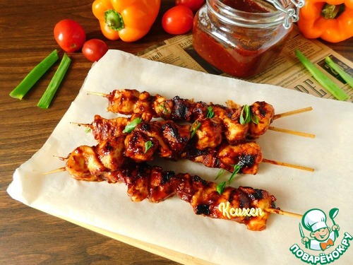 Как только шашлычки зарумянились и на них появились очаровательные полоски от гриля, начинаем обмазывать их отложенным ранее соусом Барбекю. Постоянно переворачивая, доводим шашлычки до полной готовности. За это время соус Барбекю на шашлычках карамелизируется, и они станут красивыми и блестящими. А аромат!!!