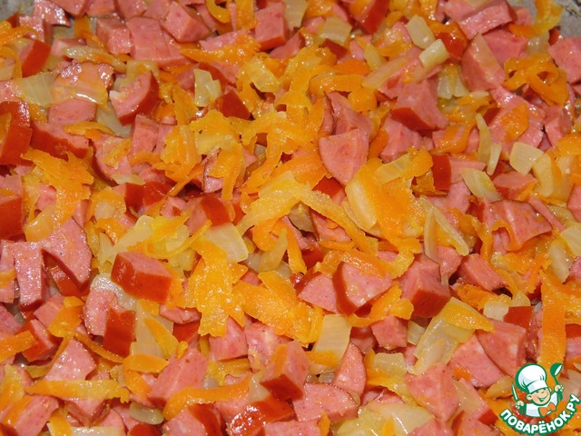 К овощам добавить мелко нарезанную копченую колбасу или мясо. Обжаривать ещё 1-2 минуты.