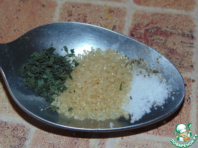 Горох уже начал развариваться, добавляем специи: соль, сахар, черный перец и сушеную мяту (по рецепту мята свежая, но у меня её не оказалось)