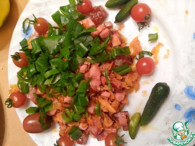 Ещё несколько минут продолжаем мешать кашу ложкой, чтобы яйцо не свернулось. Готовую кашу подавать с колбасно-овощной поджаркой и посыпав зелёным луком.