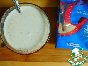 Молоко делим пополам. Одной половиной молока заливаем манную крупу и оставляем на 10-ть минут. Вторую половину молока выливаем в сотейник, добавляем соль, сахар и ванилин. Доводим молоко до кипения и добавляем манку, замоченную в молоке (вместе с молоком).