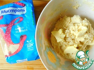 В мучную смесь вливаем дрожжи, замешиваем тесто. Продолжая замес, добавляем сливочное масло. Вымешиваем тесто в течении 5 минут, по необходимости добавляя оставшиеся 30-ть грамм муки.