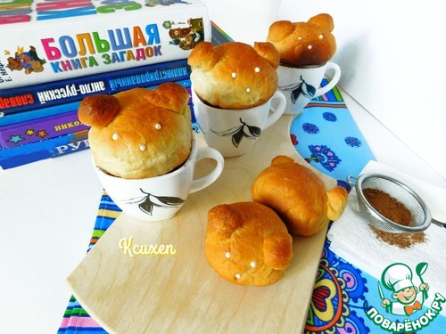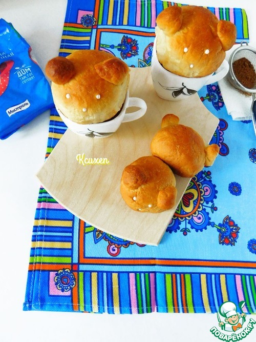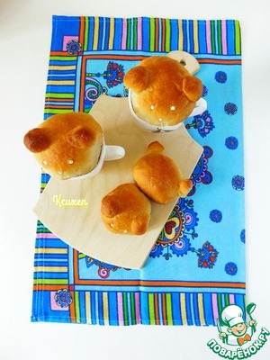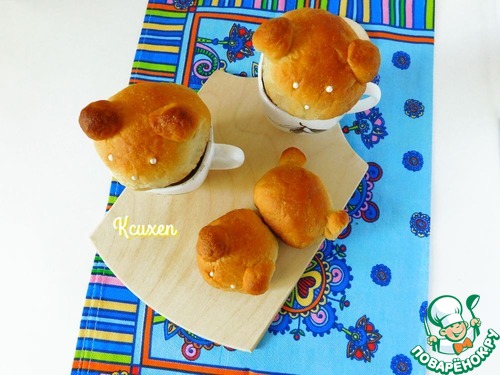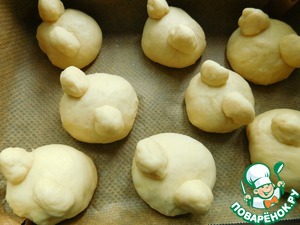 Разделим тесто на 9 шариков-из 8 шариков получится голова, а 9-й шарик разделим на маленькие кусочки (16-ть штук)-это ушки. Прикрепляем ушки к голове, выкладываем будущие булочки на противень, застеленный бумагой для выпечки, накрываем и убираем в тёплое месть на 20-30-ть минут. За это время булочки увеличатся в объёме.
