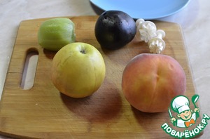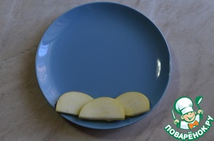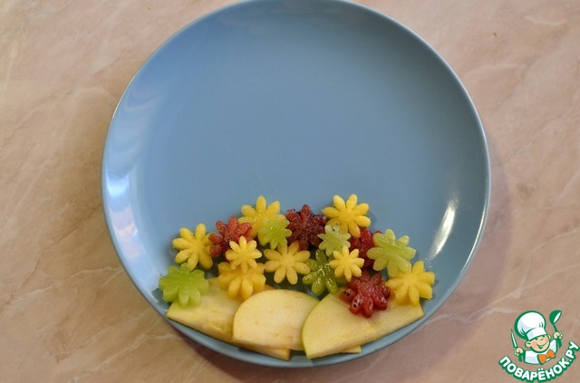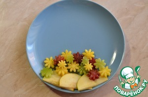 • При помощи вырубок с плунжером, вырезать цветочки. И выложить их на слайсы яблока. Далее выложить рисовую кашу, сформировать в виде облачка, из выделяющегося молока из каши, при помощи зубочистки сделать молочный дождь.