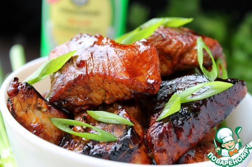 Развести крахмал в воде, добавить в маринад. Получившуюся смесь вылить в сковороду к мясу, перемешать и снять с огня. Подавать сразу же, посыпав зеленым луком.