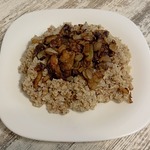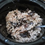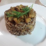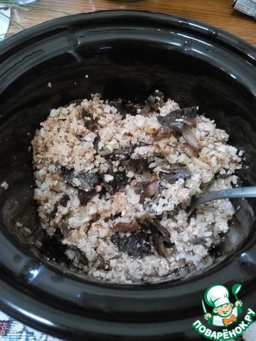 Это рецепт польской кухни, из книги Советская и зарубежная кулинария, 1977 год, в книге указано, что подавать кашу необходимо слоями: на кашу кладут слой тушеных грибов и накрывают оставшейся кашей, затем сверху снова грибы.