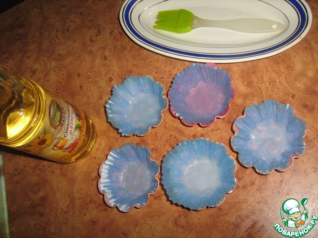 6. В силиконовые формочки вставить бумажные розетки (нравится печь кексы прямо в розетках, поэтому чуть смазала их дно и стенки подсолнечным маслом).