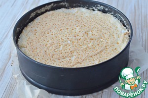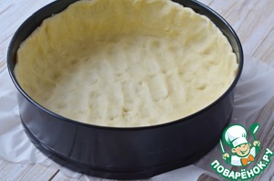 Дно формы застелить пекарской бумагой, распределить тесто по форме формируя бортики.