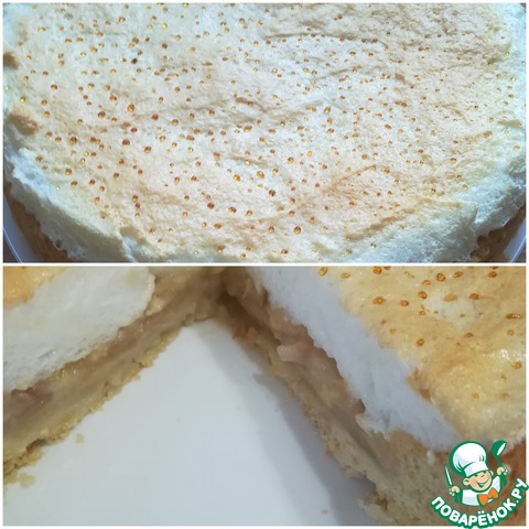 Духовку убавить до 140 градусов, вытащить пирог, выложить сверху взбитые белки, разровнять и отправить снова в духовку до румяной корочки... примерно минут 15.
