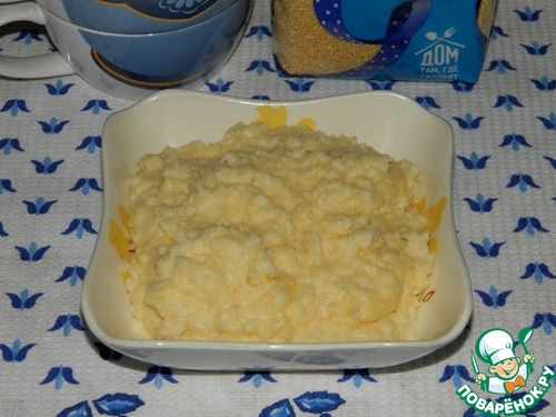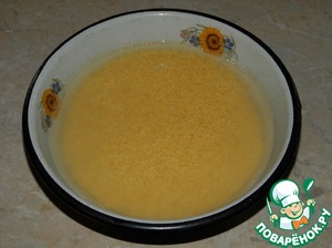 Пшено хорошо промыть в нескольких водах, растирая руками, чтобы не было белесой воды. Залить кипятком на 1-2 минуты, чтобы вышла горечь, воду слить.