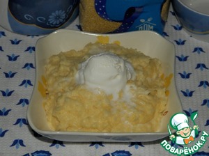 Подаю я такую кашу с шариком мороженого. Оно слегка охлаждает горячую кашу, а вид сладкого мороженого так аппетитно заманивает, что невозможно отказаться от такого лакомства!