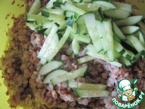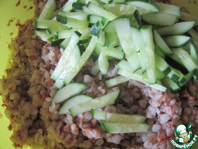 Добавляем свежие огурцы нарезанные соломкой. Можно приготовить кашу 2 способами добавив огурцы в горячую кашу и оставить до охлаждения, при этом огурцы получаются вялеными. Или добавить огурцы в остывшую кашу с луком и получается другой вкус, более свежий и ароматный.