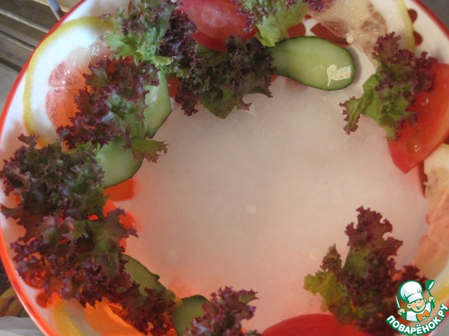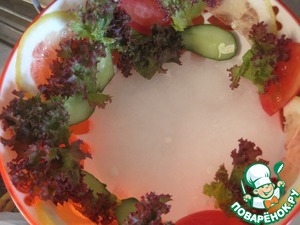 Обкладываем кусочками лимона, помидора, огурца и листьев салата.