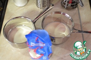 Разделить молоко на две части, добавить по 1.5 столовой ложки манки в каждый сотейник, и по 1.5 столовой ложки сахара.