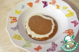 Горячую кашу следует сразу разлить по тарелочкам (из указанного количества молока получается 3 порции каши). Первой берем шоколадную кашу, 1 столовую ложку, и выливаем в центр тарелки.