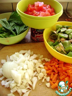 Предупреждаю-написано будет много, но делается все легко и просто-одно за другим. Овощи промыть и почистить. Нарезать крупными кубиками, лопатки зеленых бобов нарезать на несколько частей. Помидоры обесшкурить и нарезать кубиками, семена можно оставить. Перец чили нарезать тонкими колечками. У меня были сухие стручки, я залила их горячей водой на полчаса и нашинковала соломкой.