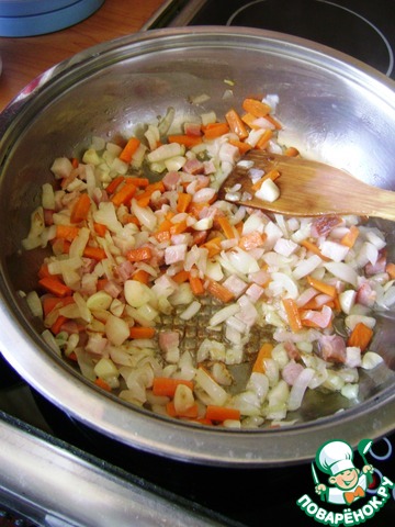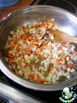 В глубоком сотейнике распустить на среднем огне в масле нарезанную кубиками грудинку. Чуть ее зарумянить и выложить лук, чеснок и морковь. Тушить до легкой золотистости.