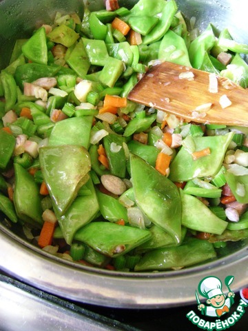 Добавить зеленую фасоль, нарезанный уголками зеленый перец, стебли сельдерея и слегка обжарить.