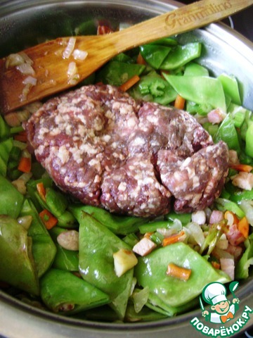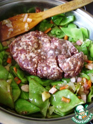 Выложить фарш и жарить, помешивая и разбивая комочки, до рассыпчатости.