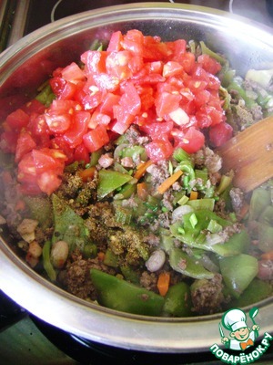 Добавить кубики помидоров, половину пряностей, перемешать и тушить под крышкой 10 минут.
