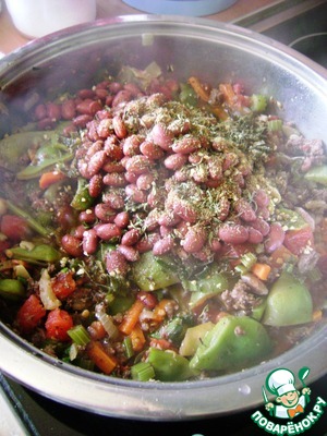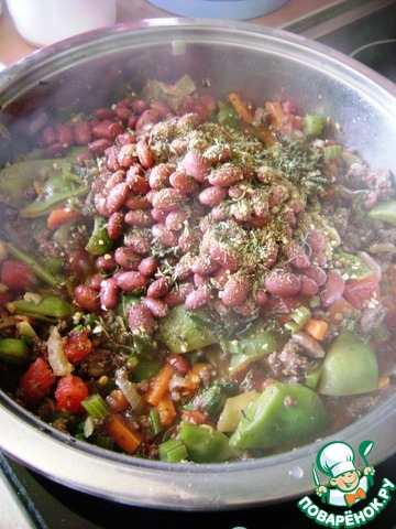 Выложить промытую и обсушенную консервированную фасоль –вкуснее красную. Добавить вторую половину пряностей, посолить и добавить щепотку сахара. Положить перец чили и, перемешав, тушить еще пару минут. Выключить, посыпать рубленой зеленью сельдерея и кинзы (у меня петрушка) и оставить под крышкой минут на 7. Острый перец я кладу ближе к концу приготовления, чтобы он сохранил свой аромат и не был слишком жгуч. Если вы любите очень острый чили, положите перец пораньше.
