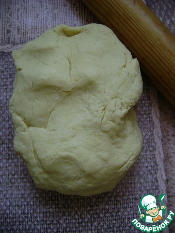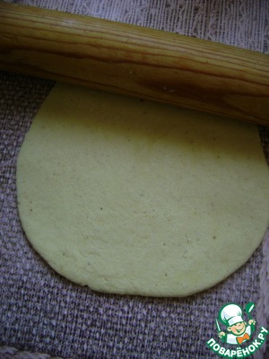 Вымесить, чуть подсыпая пшеничную муку. Тесто очень эластичное и мягкое, слегка липнет к скалке, но протрите ее мукой – и спокойно раскатаете.