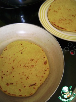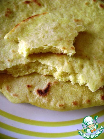 Пока готовится и настаивается чили, параллельно испечь кукурузные лепешки. Не поленитесь сделать –вкус чили лепешки раскрывают идеально! Оба вида муки просеять с разрыхлителем в миску, посолить и влить масло. Добавить воды и быстро ложкой замесить мягкое тесто.
