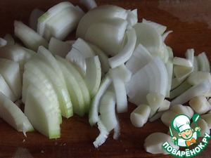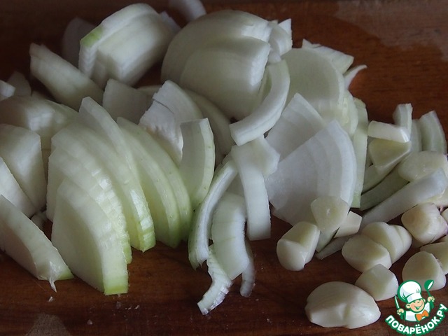 Лук нарезать кольцами, чеснок кусочками, морковь очистить и нарезать кружочками.