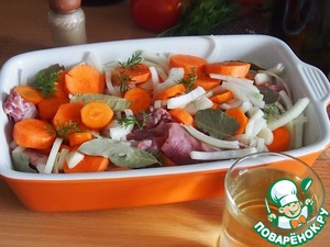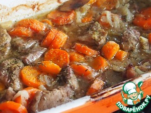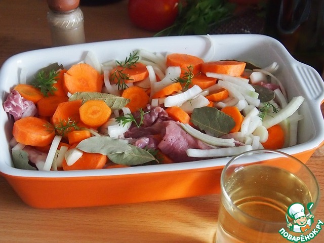 Все перемешать, выложить в посуду для запекания, посыпать перцем, посолить, добавить лавровый лист, залить вином и запекать в разогретой духовке при температуре 180 градусов примерно 1 час. Я сначала накрыла блюдо фольгой, а ближе к концу сняла ее, чтобы мяско подрумянилось.