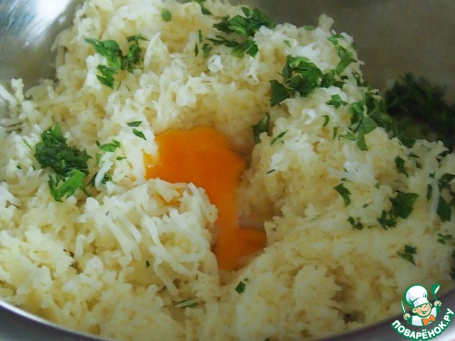 Сварить (можно это сделать заранее) картошку в кожуре. Готовую остудить, очистить и натереть на мелкой терке. Добавить мелко порубленные петрушку, тимьян и яйца.