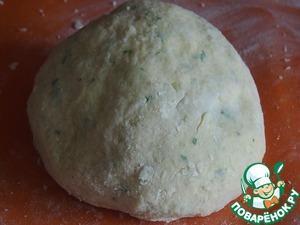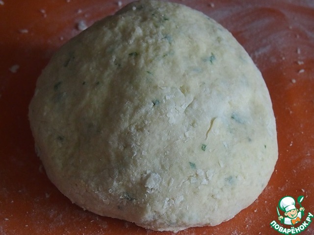 Перемешать, посолить по вкусу, добавить муку и замесить мягкое тесто. Тесто немного лепится к рукам, поэтому расчитывайте, что муки может понадобится немного больше именно на присыпку.
