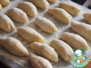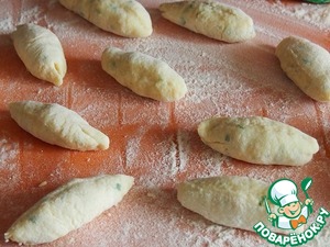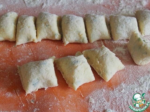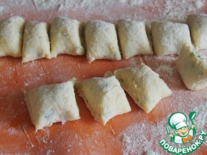 На посыпанном мукой столе раскатать тесто тонкими валиками и разрезать на кусочки.