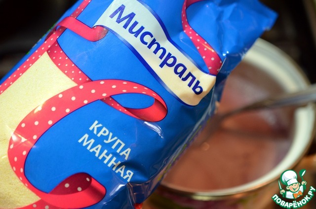 Тонкой струйкой, постоянно помешивая, всыпьте манную крупу. Я взяла манную крупу ТМ Мистраль.