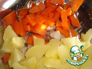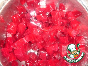 Свеклу порезать кубиками, сложить отдельно и слегка сбрызнуть растительным маслом, перемешать. Это нужно для того, чтобы свекла не окрасила остальные компоненты салата.