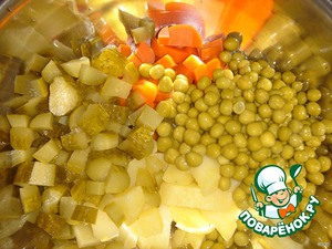 Туда же добавить порезанный огурчик и зеленый горошек.