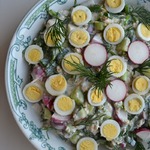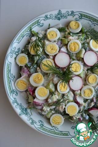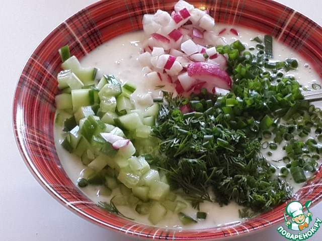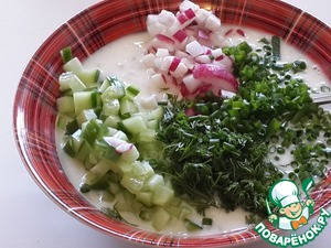 • Нарежьте мелко редис и огурец, добавьте нарезанную зелень и соль по вкусу