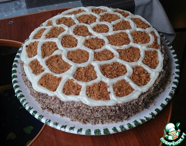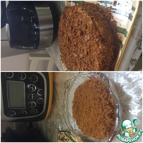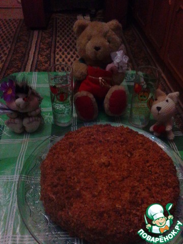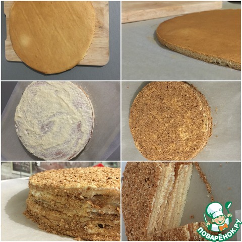 В остывшее тесто добавим муки и замесим тесто. Тесто поделим на 5 частей и раскатаем одинаковые круги. Выпекаем в предварительно разогретой духовке до 200 градусов 7 минут на противне с поварской бумагой. Как круги остыли, складываем друг на друга и подрезаем ножом, делая их одинаковыми. Смазываем круги обильно кремом, обрезанные остатки растолчем и посыпаем смазанный торт со всех сторон. Оставляем пропитываться на 6 часов в холодильнике. Торт готов!