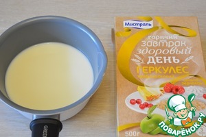 Доведите молоко до кипения, всыпьте соль, сахар, овсяные хлопья "Мистраль".