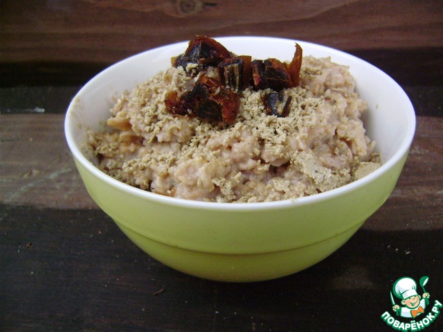 Наипростейший рецепт быстрого завтрака для сладкоежек! Каша из гречневых хлопьев с арабскими нотками во вкусе, которые придают халва и финики! Подходит для поста.